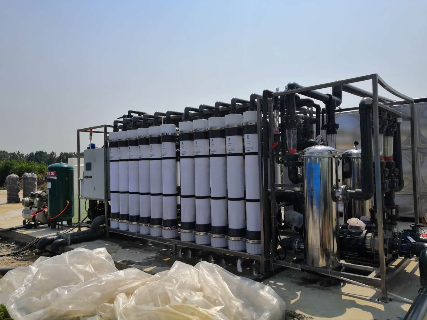 河水進(jìn)入砂濾罐,砂濾是主要以天然石英砂或錳砂作為濾料,截留水中的大分子固體顆粒和膠體,使水澄清。砂濾出水首先通過(guò)保安過(guò)濾器,再進(jìn)入超濾膜組。保安過(guò)濾器設(shè)在超濾膜之前,為了去除水中細(xì)小微粒,防止其進(jìn)入超濾膜柱,造成膜污染或刮傷膜絲。超濾膜組以膜絲為過(guò)濾介質(zhì),膜兩側(cè)的壓力差為驅(qū)動(dòng)力進(jìn)行過(guò)濾分離,得到高品質(zhì)的出水。超濾膜只允許溶液中的溶劑(如水分子)、無(wú)機(jī)鹽及小分子有機(jī)物透過(guò),而將溶液中的懸浮物、膠體、蛋白質(zhì)和微生物等大分子物質(zhì)截留,達(dá)到凈化和分離的目的。